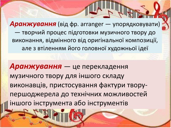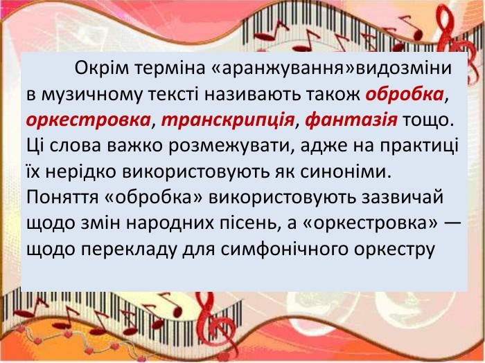 Обробка пісні — це її видозмінення за допомогою музичних прийомів, творче перевтілення для різного виконання.